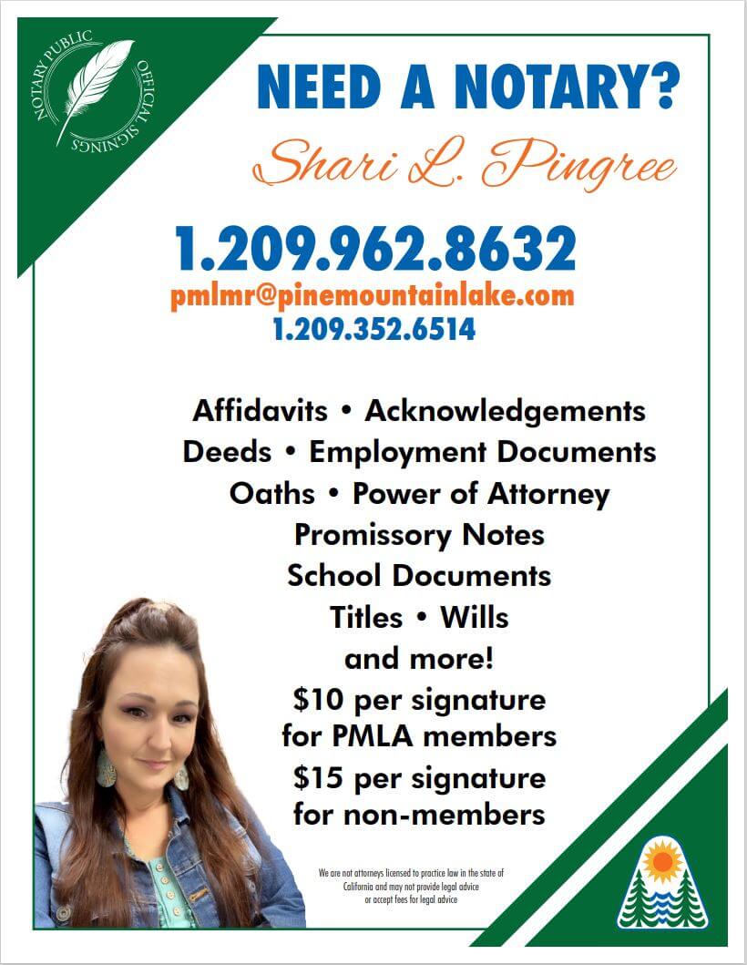 We are excited to share that notary services are now being offered at the Pine Mountain Lake Association Administration Office. Shari Pingree, our Member Relations team member, is a certified in-house Notary and is ready to assist you. To schedule an appointment, please call 1-209-962-8632.