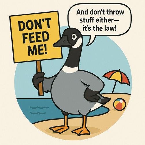 Don’t feed the geese. Bread, chips, and snacks may feel like a friendly gesture, but it actually makes them sick, encourages overpopulation, and guarantees more goose “gifts” on our lawns, beaches, and docks.
