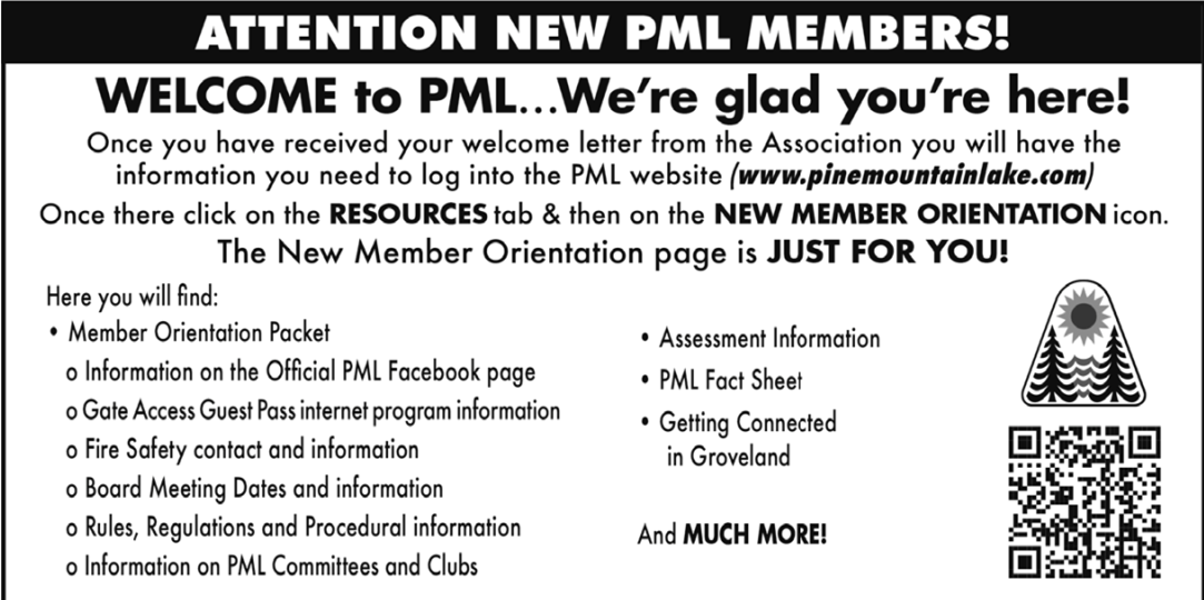 A convenient way to get information, find links, review frequently asked questions, or continue to develop a better understanding of the rules and regulations, twenty-four hours a day, seven days a week is to visit the Pine Mountain Lake Community Standards web page. You will find our page at www.pinemountainlake.com under the resource tab, click on the Community Standards Icon or Scan the QR code for quick on the go access. Here you will find other resources such as FAQs, a list of common rules, rental registration or the link submit an exterior project such as a dog run.
