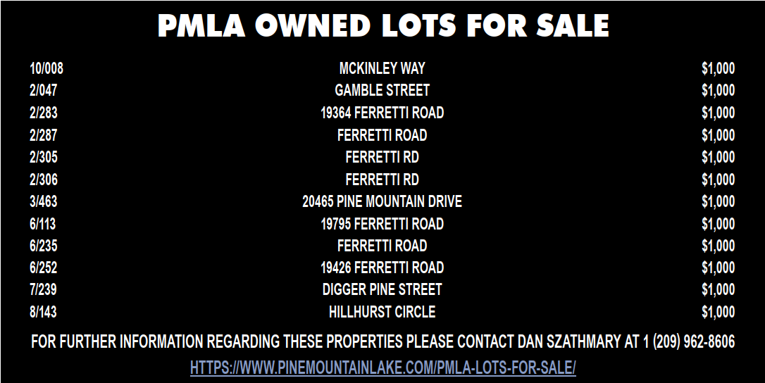 Would love to hear from you. Please feel free to contact me anytime. Controller@PineMountainLake.Com or 1-209-962-8606.