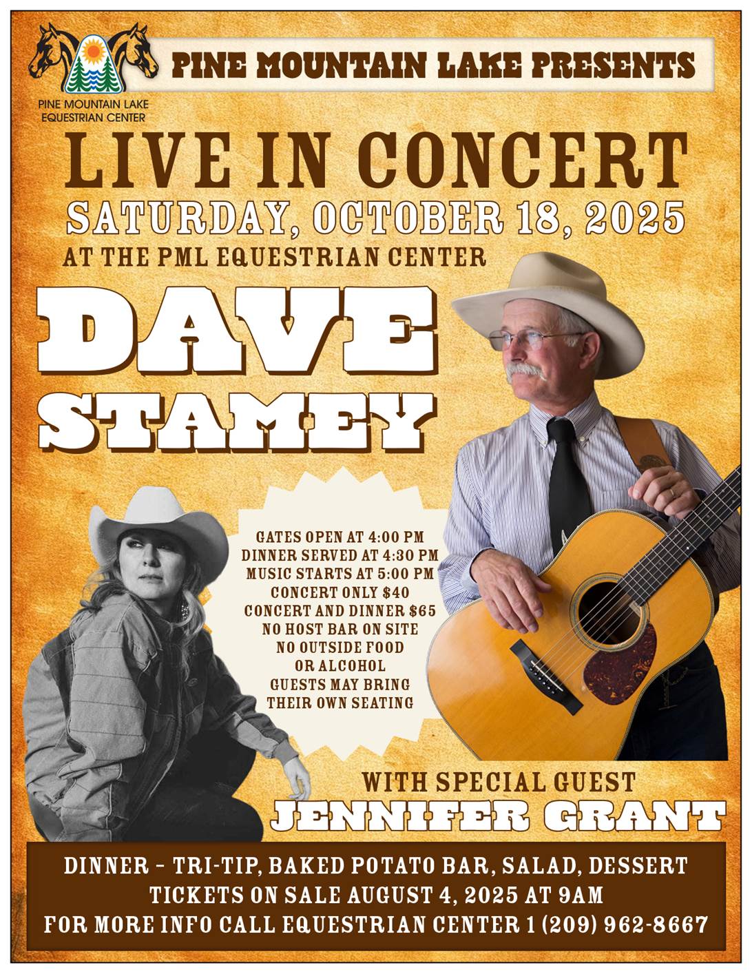 October is also bringing some exciting events to the PMLA Equestrian Center. On Saturday, October 18th, we are proud to host Dave Stamey and Jennifer Grant in concert. Tickets are on sale now and may be purchased on our website or at the barn office. Pricing is $40 for the concert only or $65 for dinner and concert. Dinner will feature tri-tip, a baked potato bar, salad, and dessert. Gates open at 4:00 p.m., dinner will be served at 4:30 p.m., and the music begins at 5:00 p.m. A no-host bar will be available, but please note that outside food and alcohol are not permitted. Guests are welcome to bring their own seating to enjoy the show.