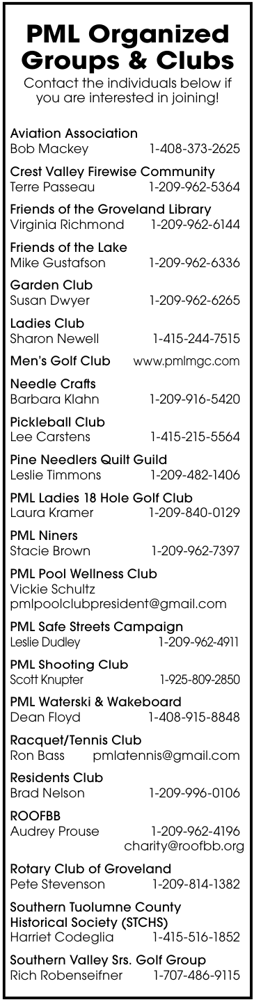 To Join the PML Pickleball Club email Tammy Talovich at TamTally1@gmail.com or call 209.605.7904