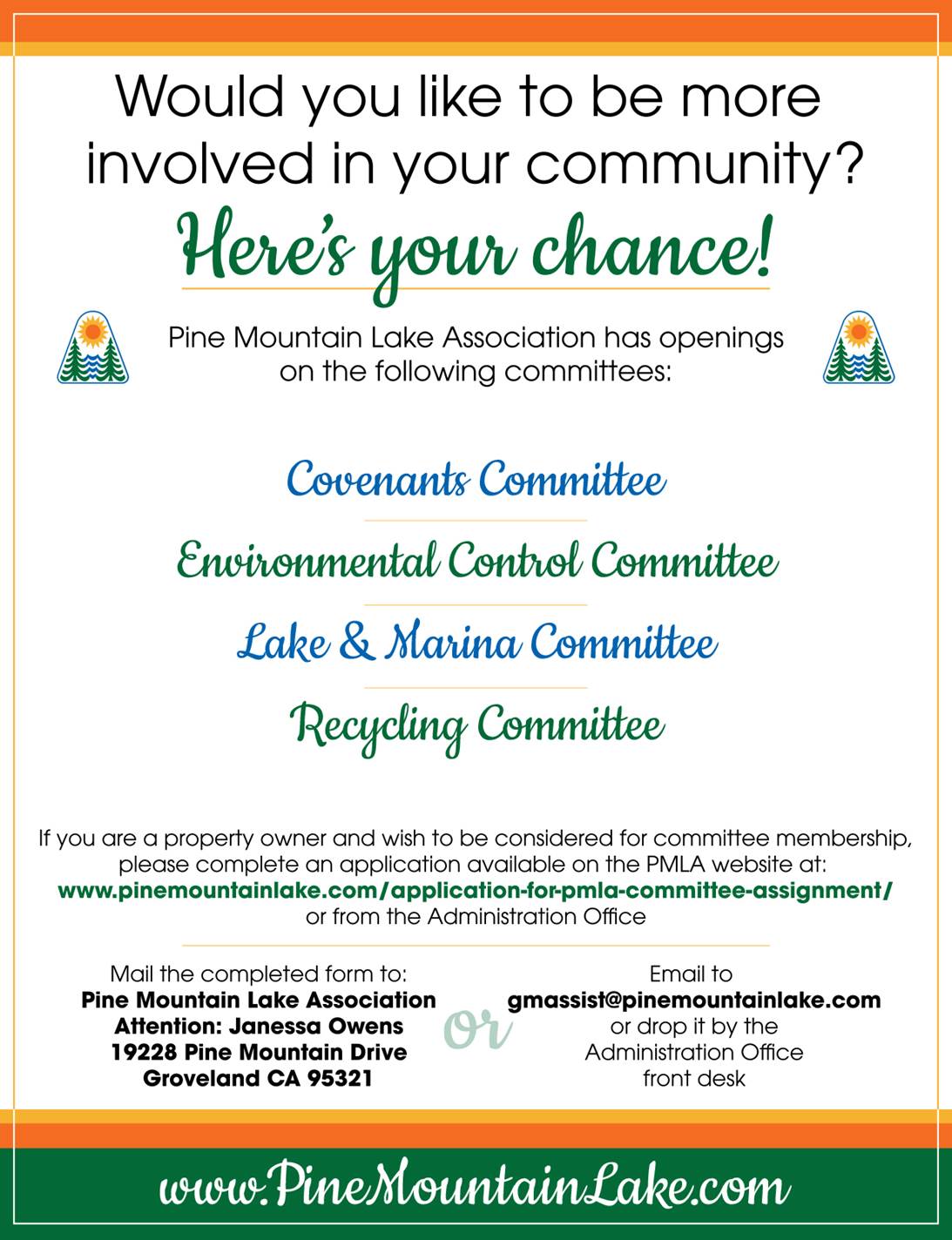 The Pine Mountain Lake Safety and Security Committee is a standing committee authorized by the PMLA Board of Directors to inform its decision making and promote its mission. The Committee meets every month.