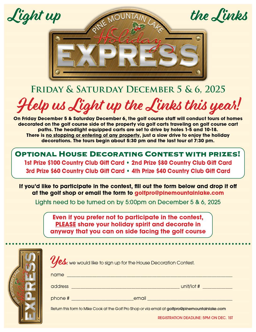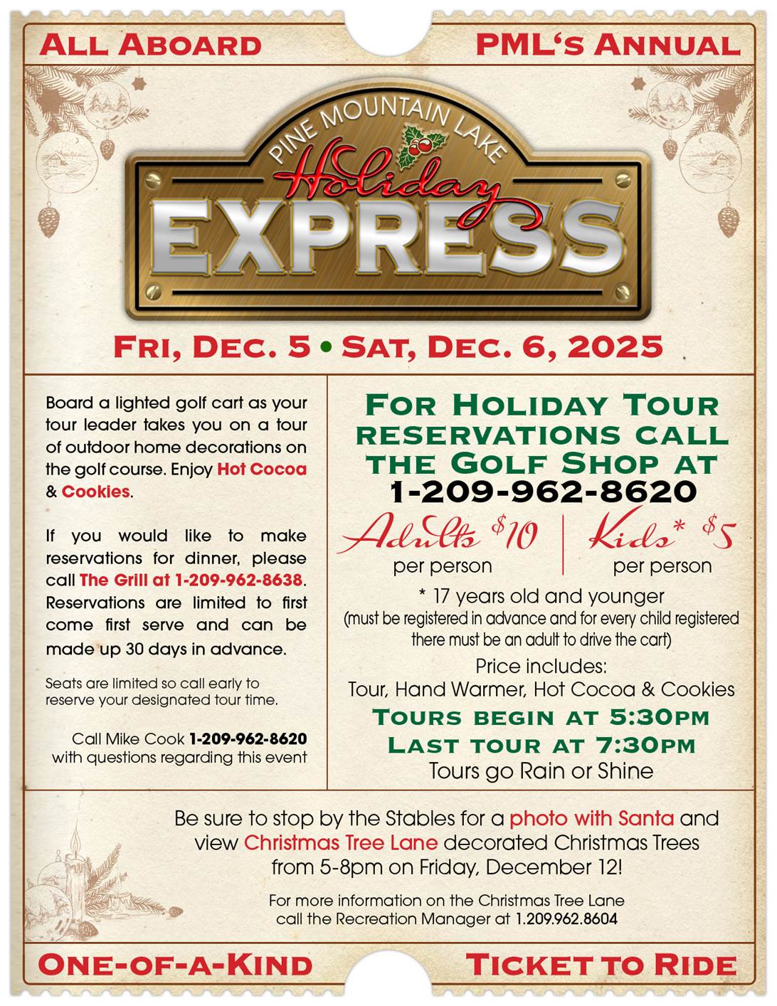 If you are not aware of what the Holiday Express is; the Holiday Express is an event where PML Property Owners whose property is on the Golf Course on holes 1-5 and 10-18, light up their Golf Course portion of their property with lights and Christmas decorations and PML conducts tours where spectators tour the Golf Course at night to view the lights and decorations. This is PML’s version of “Candy Cane Lane”. It is our hope that EVERY PML home owner whose property is on the Golf Course will take part in this event and light up the Golf Course side of their property, even if it is just putting up a few strings of lights. This year’s event is scheduled for Friday December 5 and Saturday December 6. See fliers in the newsletter for more information. Sign-ups for the tours will be available starting in the first week of November. For more information call the Golf Shop at 209-962-8620.
