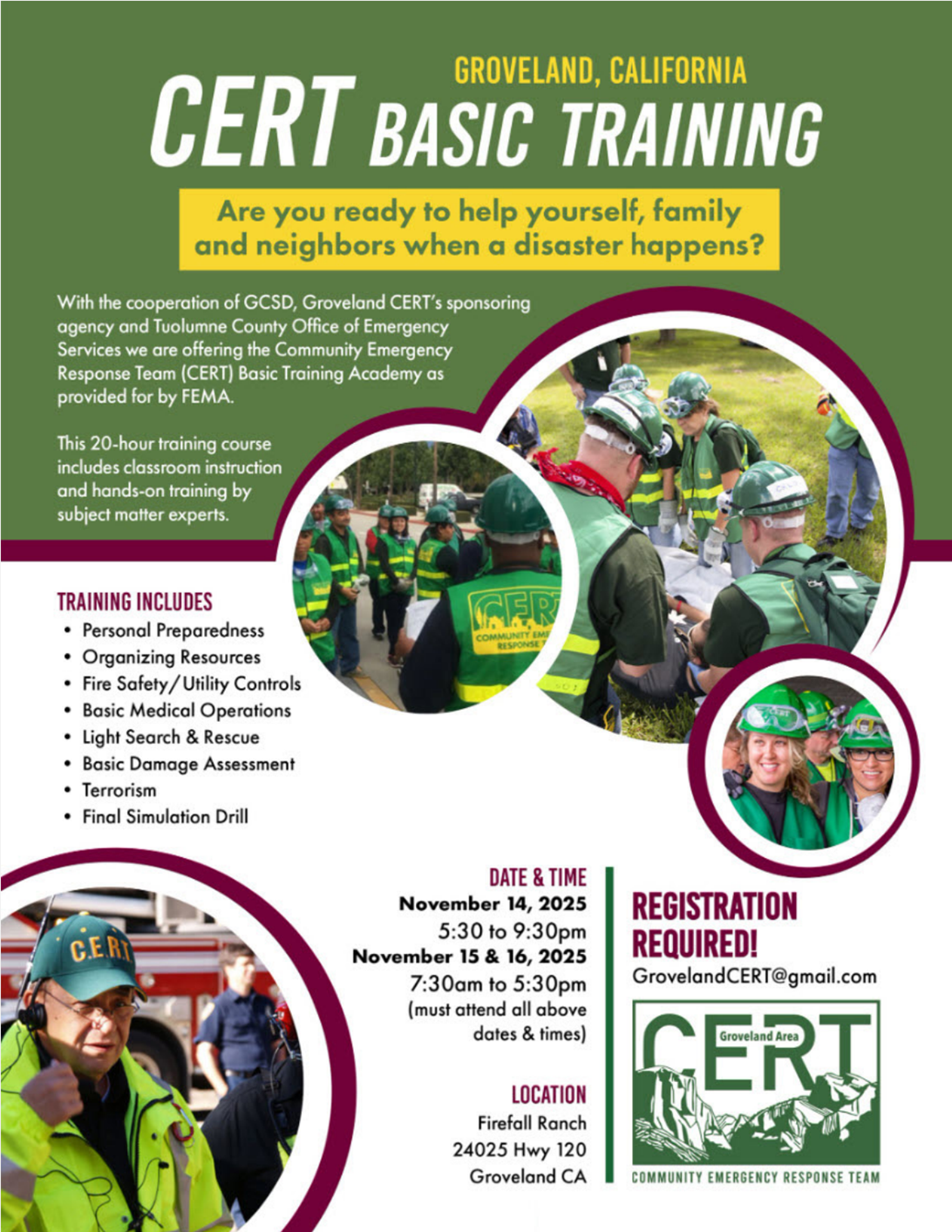 CERT will hold its FEMA provided Basic Training Nov 14-16 in Groveland. ALL are welcome. It is Free. There are still some available.