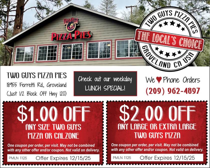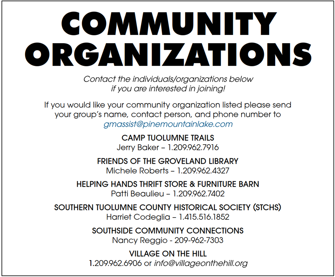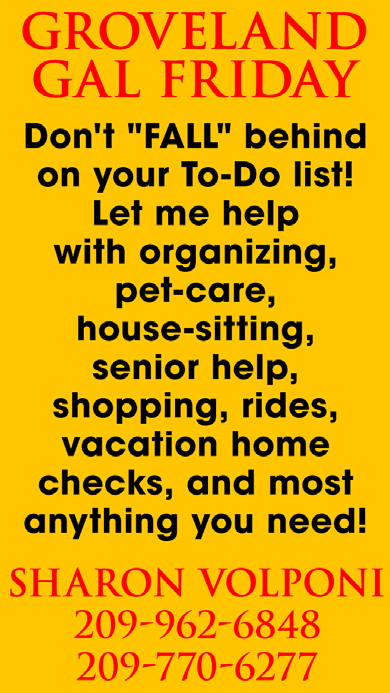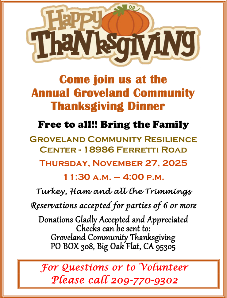 Once again, we’re the proud sponsors of the Groveland Community Thanksgiving Dinner on Thanksgiving Day, at the Groveland Community Resilience Center, so we’ll see many of our community members there. This is a FREE dinner to anyone who walks in the door. If you don’t have other plans, come and have a super meal with many other community members. You’re sure to see many folks you know or even meet some new friends. If you’d like to volunteer to work at the dinner, on one of the 3 shifts, please call 209-770-9302 and leave your contact information.