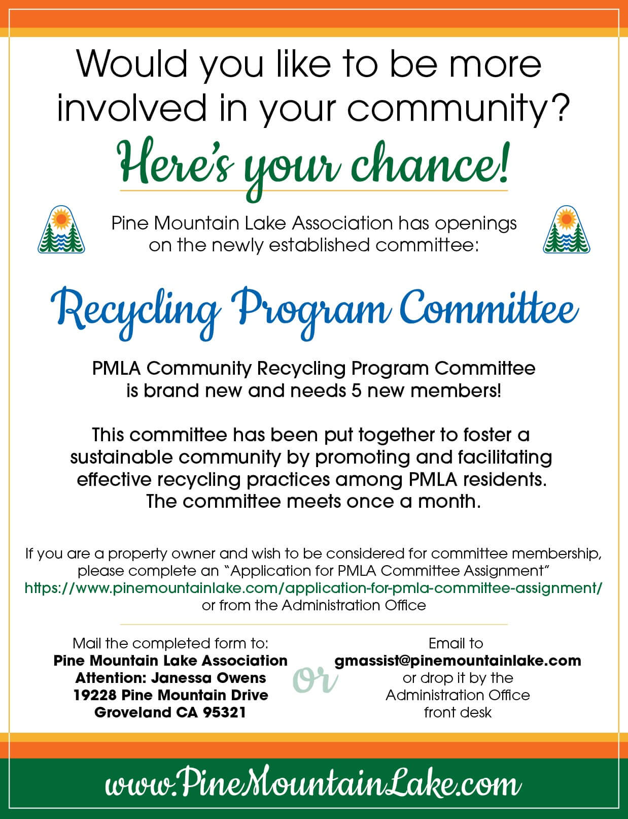 PMLA Community Recycling Program Committee is brand new and needs 5 new members!