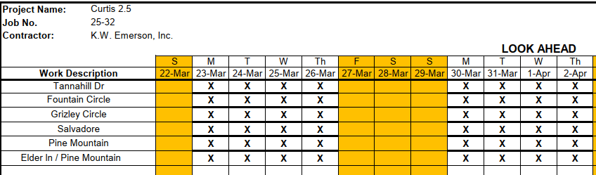 Please see the PG&E project “Look Ahead” schedule below for the current work on Butler Way, Tannahill Drive, Salvador Court, Pleasant View Drive, Cassaretto Court, and Chamberlain Court.